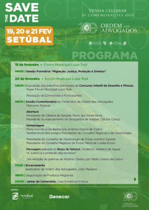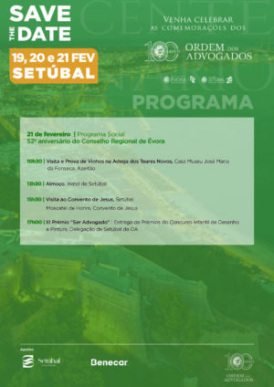 O próximo evento das Comemorações do Centenário da Ordem dos Advogados terá lugar em Setúbal e assinala igualmente o 52.º Aniversário do Conselho Regional de Évora e o 25.º Aniversário da Delegação de Setúbal, nos dias 20 e 21 de fevereiro.
